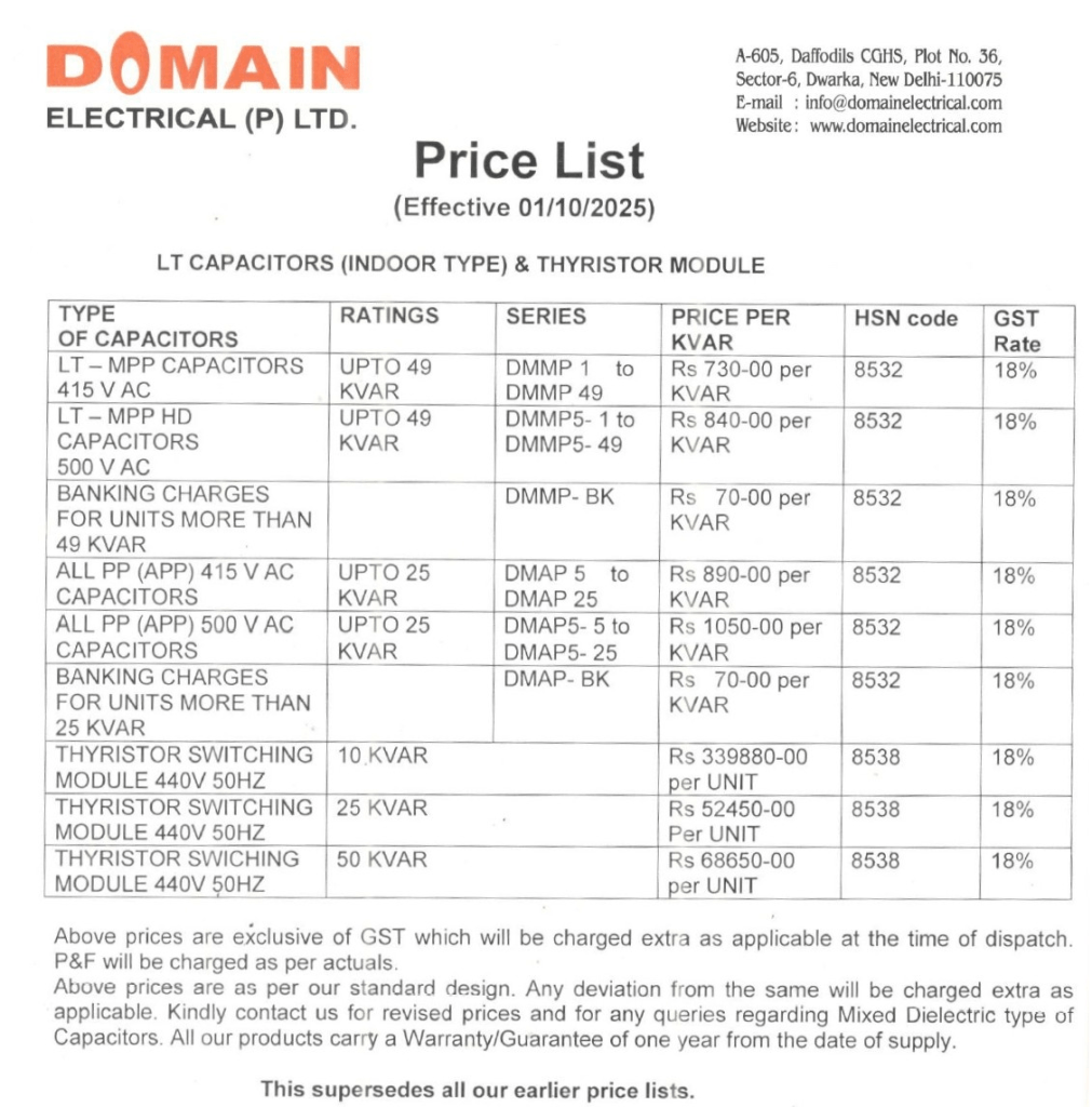 LT Capacitors & Thyristor Module Price List The Power FULL Connection As the design & manufacture of Domain equipment are under constant improvement, the products supplied may differ in detail from the specifications.Like Loading...