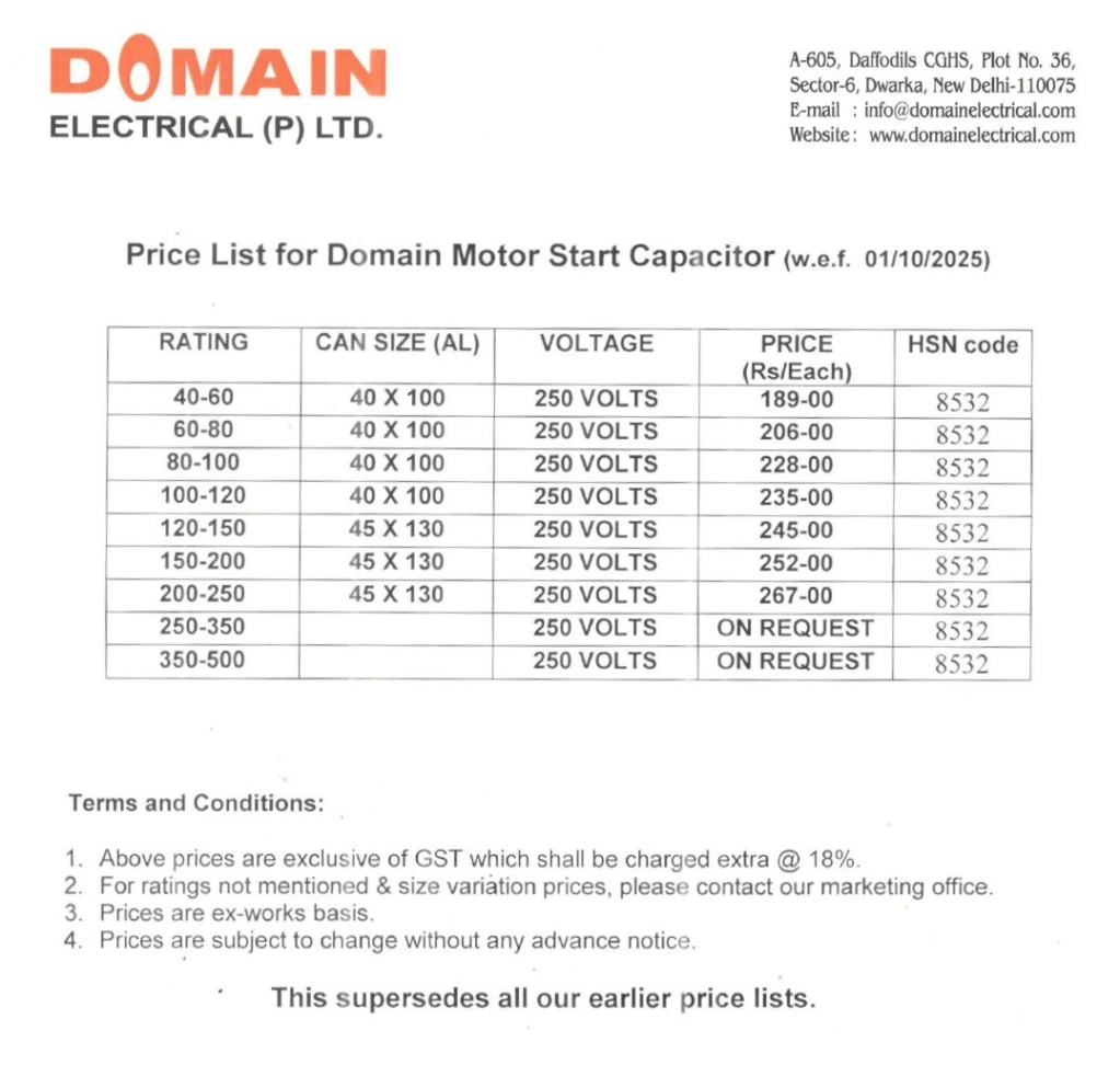 MOTOR START CAPACITORS PRICE LIST The Power FULL Connection As the design & manufacture of Domain equipment are under constant improvement, the products supplied may differ in detail from the specifications.Like Loading...